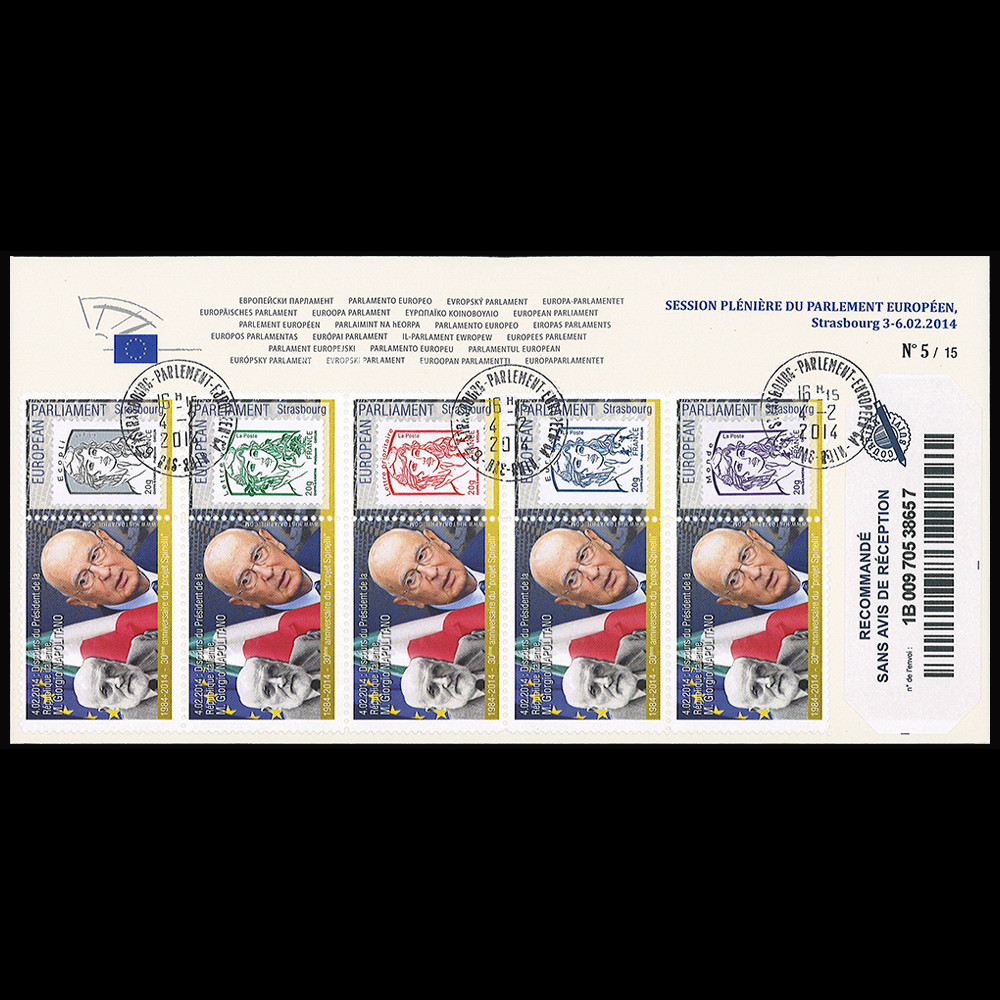 - Postage France "Marianne and The Youth" (20g Eco, Green Letter, Prio, Europe, World) fixed on a strip of 5 label stamp holders "European Parliament, Strasbourg 04.02.2014 - Speech by Mr. Giorgio NAPOLITANO, President of the Republic of Italy"