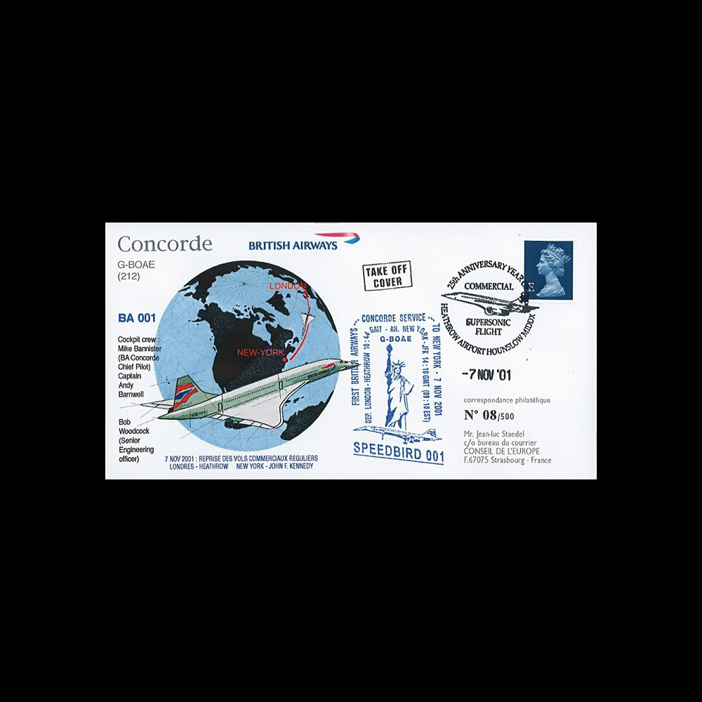 N°G-BOAE7/11 : UNITED-KINGDOM Special FDC «Return to passenger flights British Airways Concorde London-New York / take-off Heathrow, 7.11.2001»