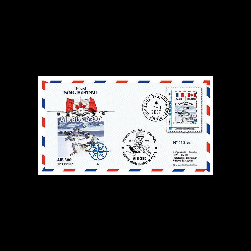 N°A380-53 : 1 value personalized stamp priority letter 20g (France)on special FDC «A380, 1st flight Paris - Montreal, Sled dogs, 2007»
