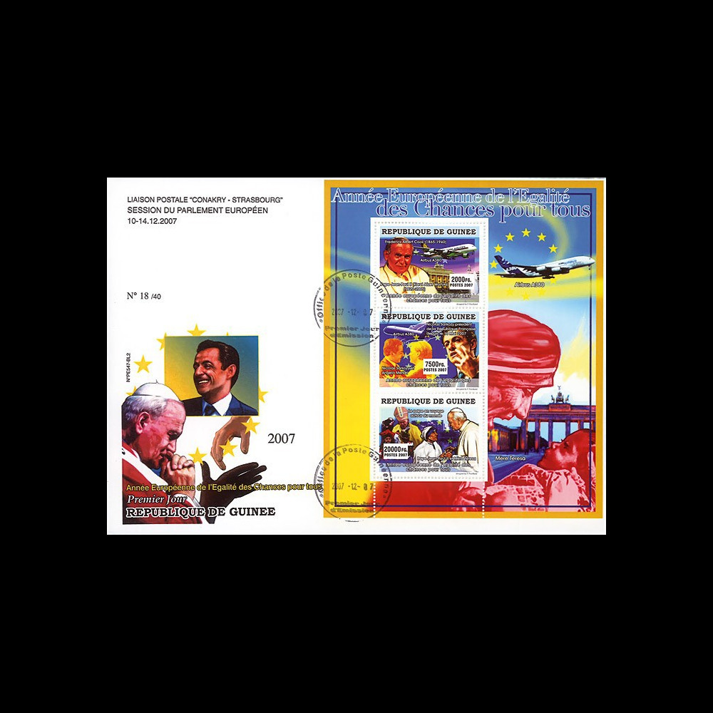 No. A380-93 : FDC 1st Day of block 2000Fg + 7500Fg + 20000Fg Republic of Guinea 2007 2007 "Airbus A380, Pope Jean-Paul II, President Sarkozy and Ms. Merkel, Jean-Paul II and Mother Teresa"