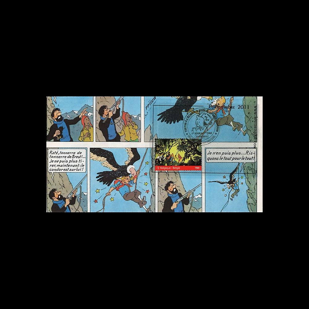 Franked TYPE 5 : Belgium 1 value 0,61€ "The Adventures of TINTIN - Prisoners of the Sun, 2011" from the Belgian sheetlet "Tintin on screen" postmarked in Brussel "First Day - TINTIN on SCREEN" (Belgium) dated August 29, 2011