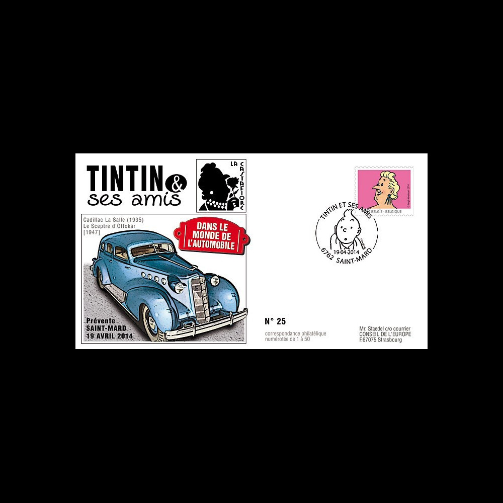 TIN14-6 : Belgium, "COLLECTOR" FDC First Day "Tintin and his friends in the world of cars : The Castafiore / Cadillac La Salle (1935) / King Ottokar's Sceptre (1947)".