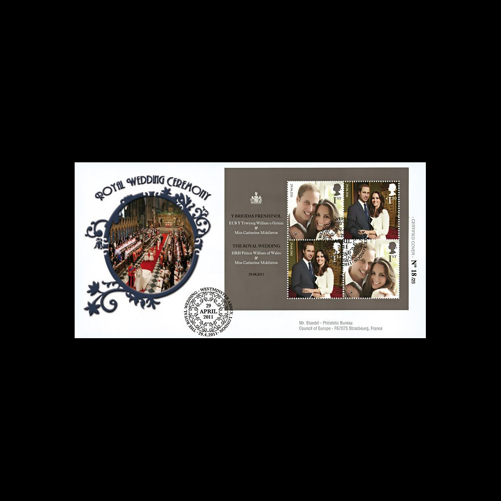 Franked United-Kingdom special block of 4 values "The Royal Wedding - HRH Prince William of Wales & Miss Catherine Middleton, 2011" postmarked in Westminster Abbey, London "The Royal Wedding" (United-Kingdom) dated April 29, 2011