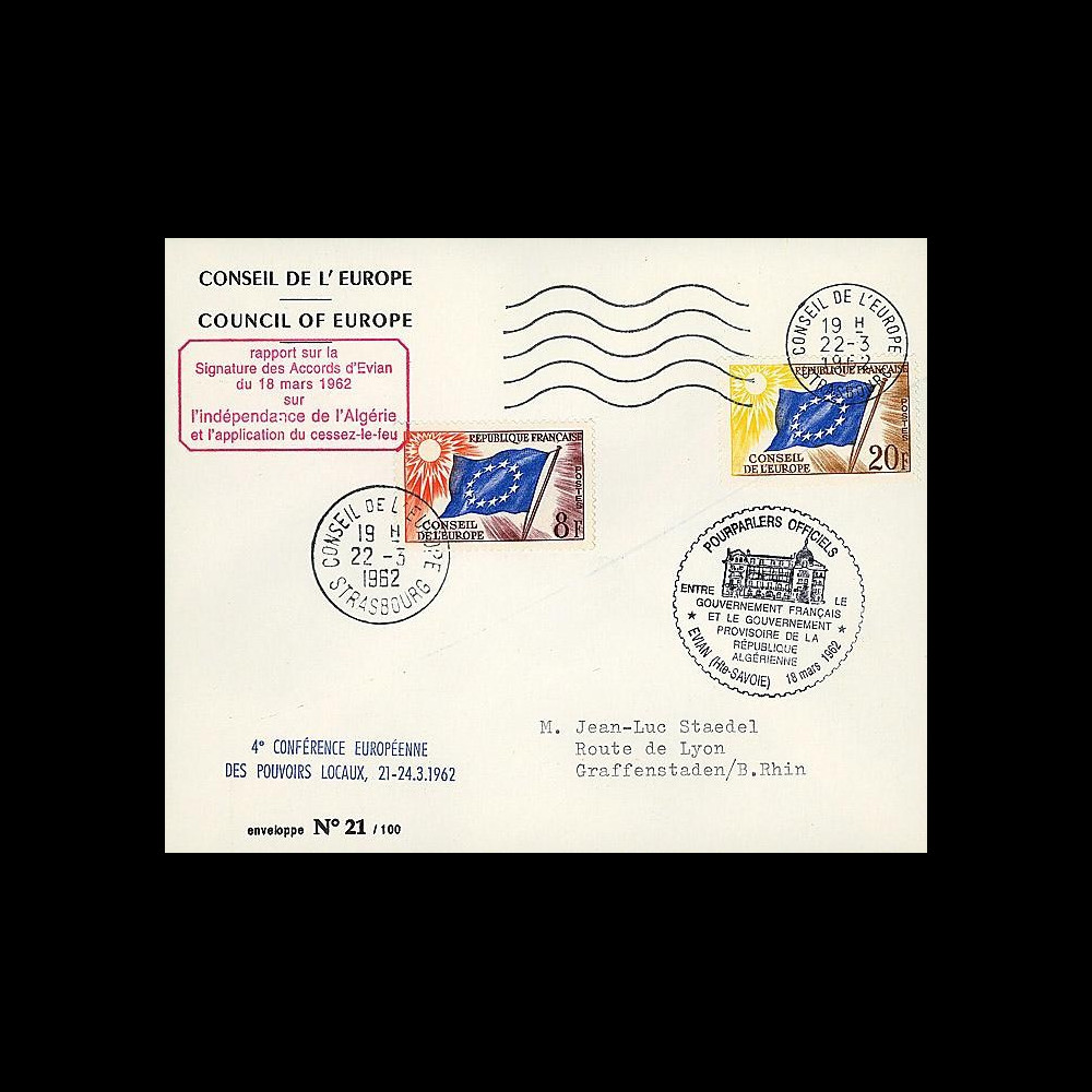N°ALG2 : Council of Europe Official FDC - Fourth European Conference of the Local Authorities in the Council of Europe to Strasbourg (France) March 21-24, 1962 "Signing of the Treaty of Evian Accords (March 18, 1962) on the Independence of Algeria and application of the cease fire" 1962 :