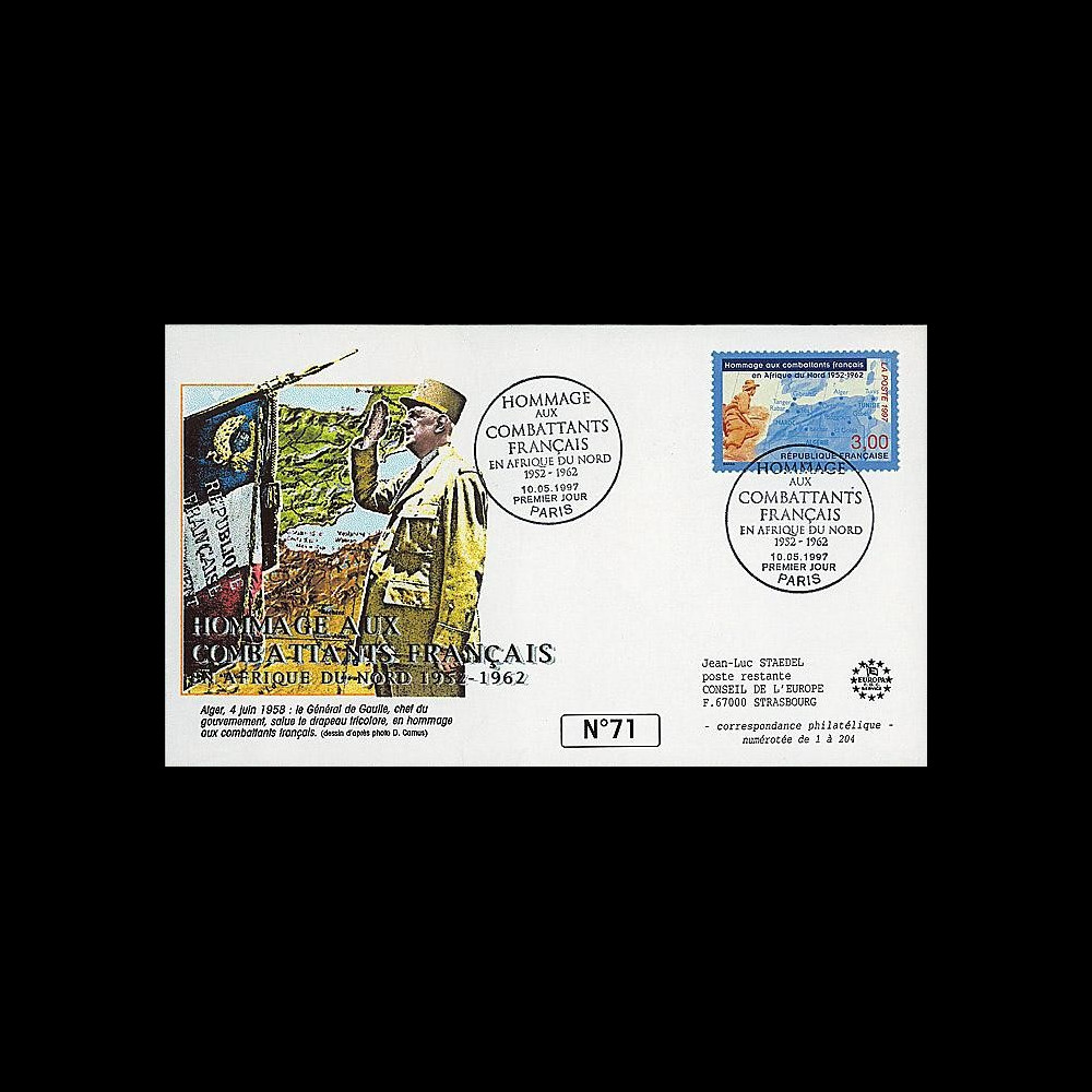 Franked France 1 value 3,00FF "Tribute to French Soldiers in North Africa 1952-1962, 1997" postmarked in Paris "Tribute to French Soldiers in North Africa 1952-1962" (France) dated May 10, 1997