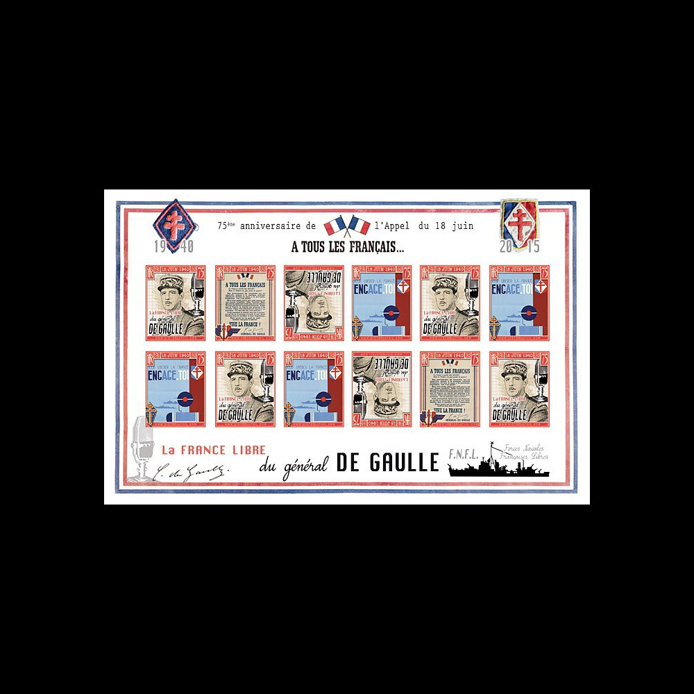 No. DG15-1FND : Sheetlet of 12 Patriotic labels gummed and not perforated “June 18, 2015 : 75th anniversary of the Appeal of Resistance June 18, 1940 by the General DE GAULLE / General DE GAULLE, President of Provisional Government of French Republic / FREE FRANCE : Free French Naval Forces (F.N.F.L.) / Cross of Lorraine / 1939-1945 : World War 2 (WWII)" (Size : 14,7 x 21 cm) 2015 :