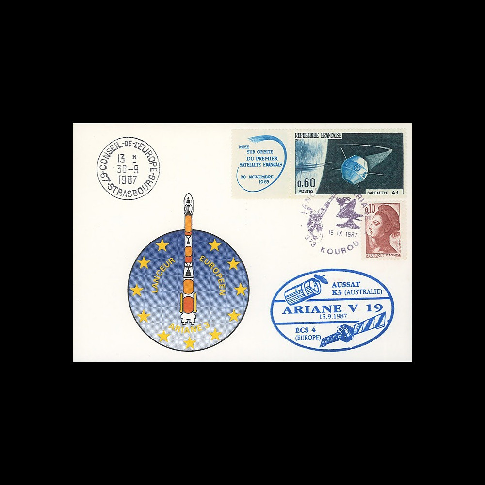 + Blue cachet "AUSSAT K3 Satellite (Australia) & ECS 4 Satellite (Europe) - ARIANE V19" (French Guiana) dated September 15, 1987
