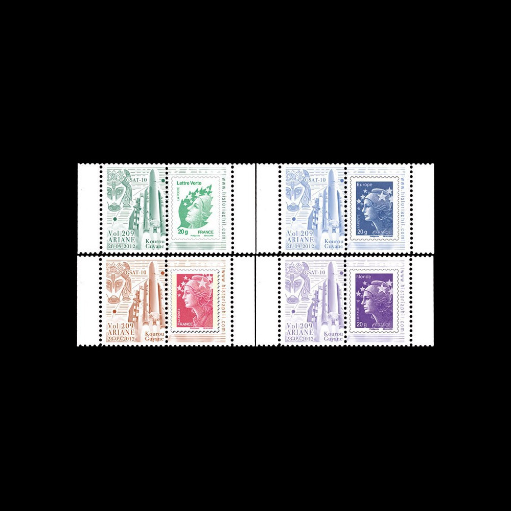 No. VA209L-PT1/4 : set of 4 gummed and perforated Stamp Display Units “Launch 209 Ariane 28.09.2012 - GSAT-10 (India)“