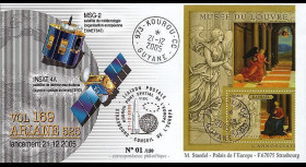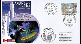 Franked TYPE 1 : France 1 value Priority letter 20g red "Marianne and Youth, 2014" on Private display unit "Kourou (French Guiana) March 22, 2014 : Launching Ariane Rocket - Flight No. 216 / Telecommunication satellites Astra-5B & Amazonas-4A / Bull and Matador" postmarked in Kourou (French Guiana) dated March 22, 2014