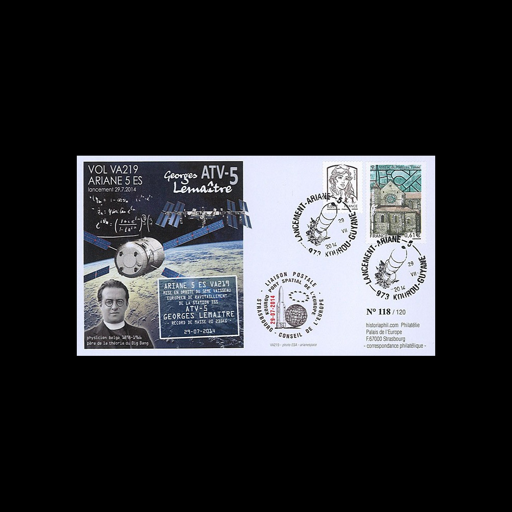 N°VA219L-T2 : FDC KOUROU (French Guiana) "July 29, 2014 : Launching ARIANE 5 A5 ES Rocket - Flight No. 219 / Record mass orbited 20.235 kg - Arianespace to Launch the fifth European cargo ship ATV-5 Georges LEMAÎTRE for the ISS station" (TYPE 2) 2014 :