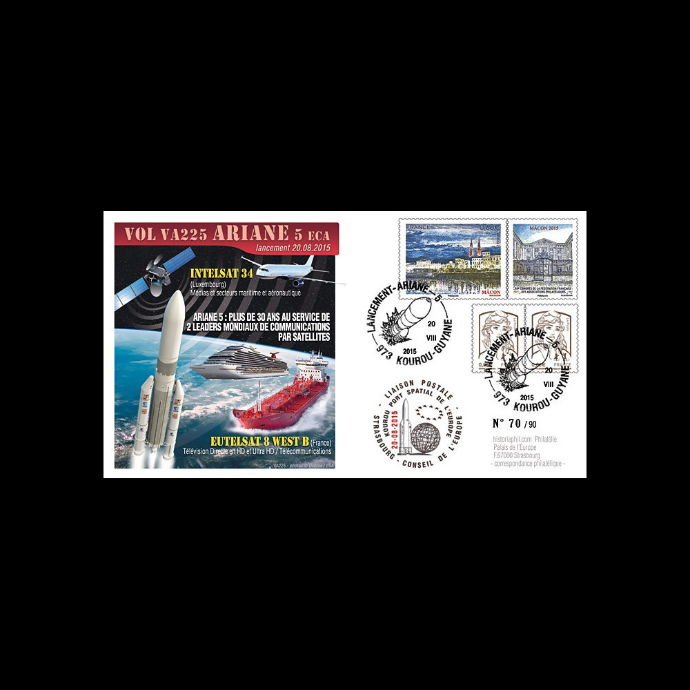 N°VA225L-T2 : FDC KOUROU (French Guiana) "August 20, 2015 : Launching ARIANE 5 ECA Rocket - Version 579 - Flight No. 225 / Arianespace to Launch EUTELSAT 8 West B Telecommunication satellite (France) and INTELSAT 34 Telecommunication satellite (Intelsat Ltd. USA)" (TYPE 2) 2015 :