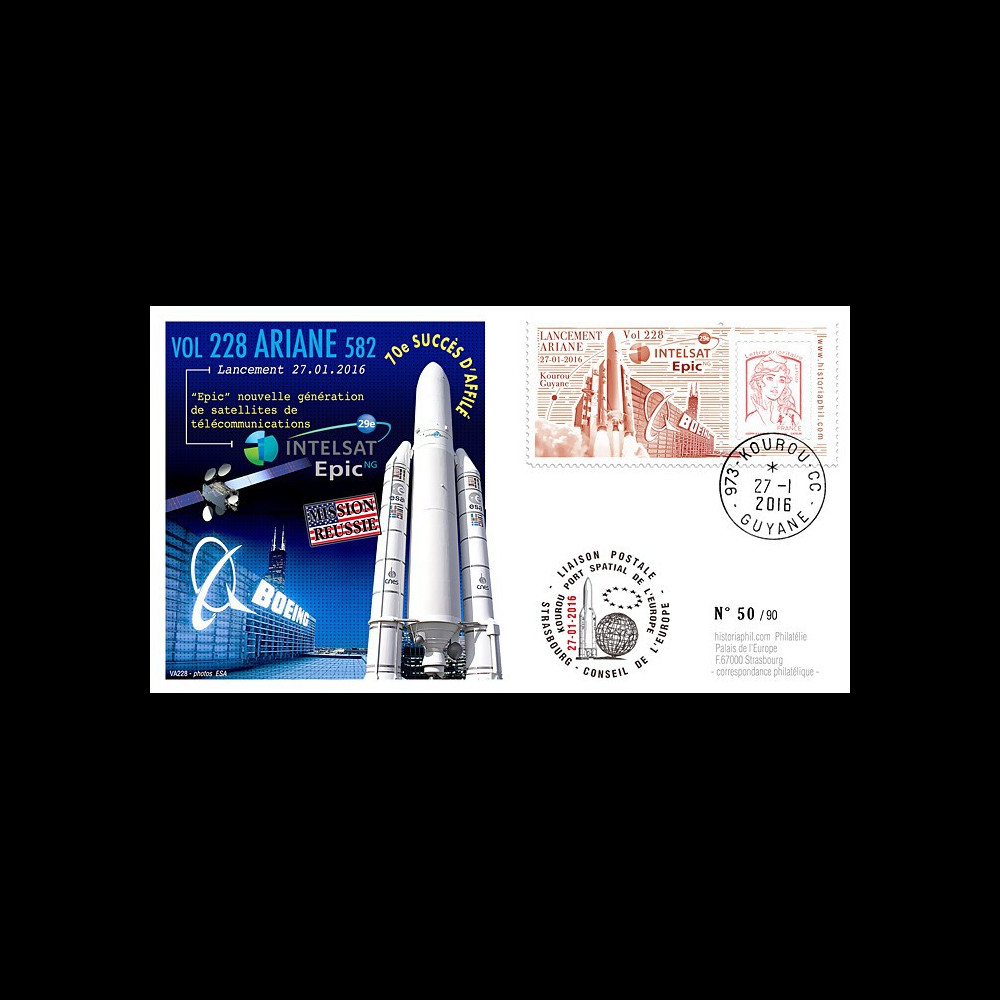 N°VA228L-T1 : FDC KOUROU (French Guiana) "January 27, 2016 : Launching ARIANE 5 ECA Rocket - Version 582 - Flight No. 228 / Launching new generation of Telecommunication satellites INTELSAT 29e EPIC (Intelsat, USA)" (TYPE 1)