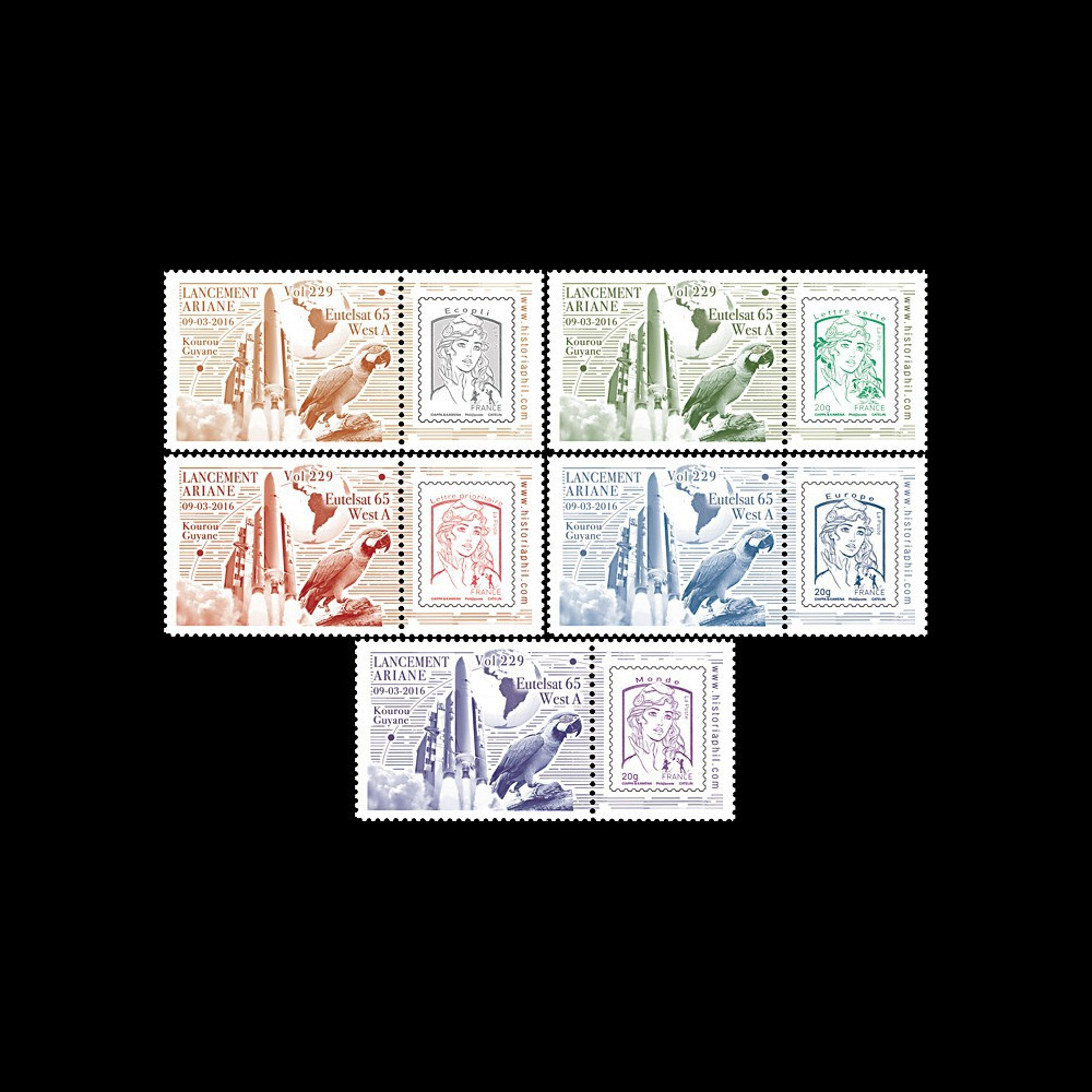 N°VA229L-PT1/5 : Set of 5 values "Marianne and Youth" on Private display units perforated and gummed "March 9, 2016 : Launching ARIANE 5 ECA Rocket - Version 583 - Flight No. 229 / Launching Telecommunication satellite EUTELSAT 65 West A (Eutelsat, France) / Parrot"
