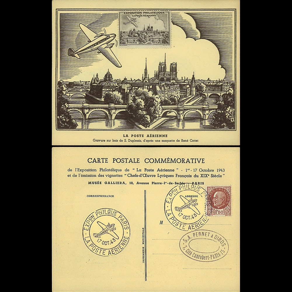 oblit. GF Paris “EXPOSITION PHILATÉLIQUE PARIS - LA POSTE AÉRIENNE” 17.10.1943