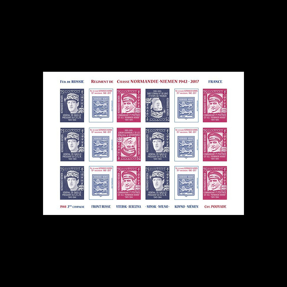 NIEM17-5FND : Sheetlet of 6 triptychs INVERTED PAGES "75 years of of the NORMANDIE-NIEMEN Hunting Regiment / 1944 - 2nd campaign Russian Front, Vitebsk, Berezina, Minsk, Niemen / Gal. de Gaulle and Cdt. Pouyade / regiment badge"