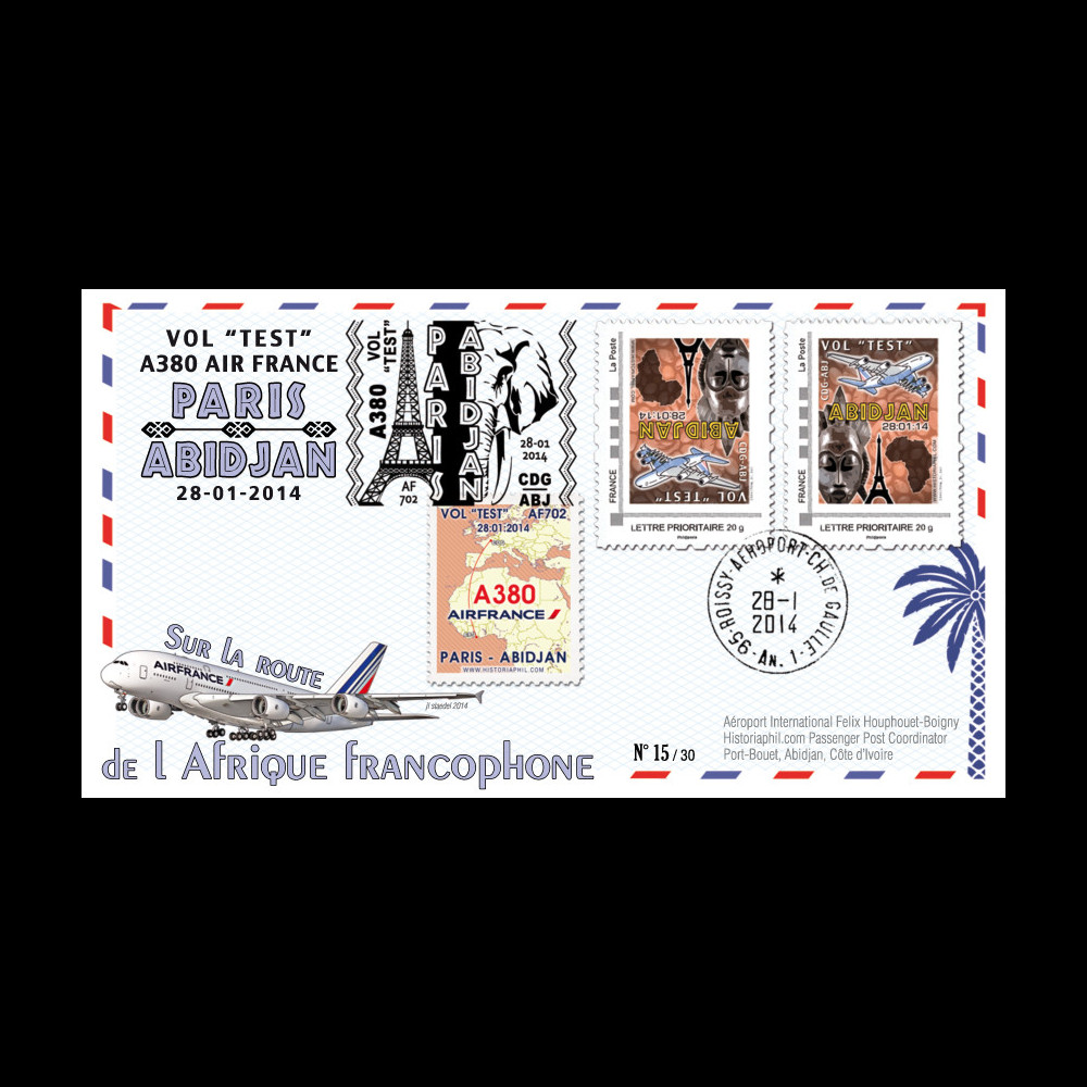 + Red cachet "Airbus A380 Air France - Test Flight AF702 Paris-Abidjan / Eiffel Tower and Elephant" (France) dated January 28, 2014