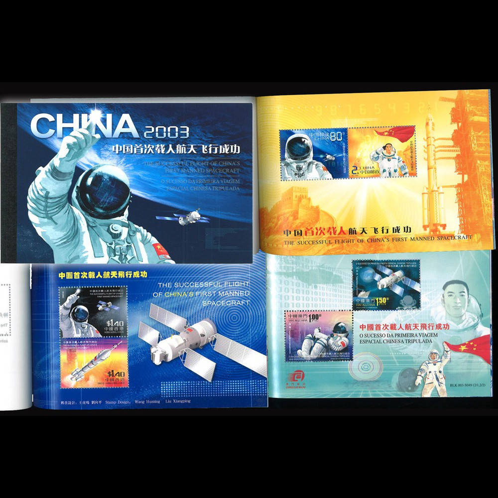 Prestige booklet «Taïkonaute» contening the 3 block-booklets of 2 values issued jointly by the Postal Administrations of the Populary Republic of China, of Hongkong and of Macau, as well as lots of pages devoted to the launching of «Shenzhou V».