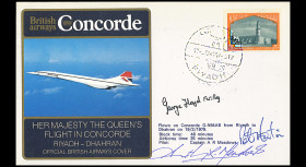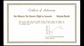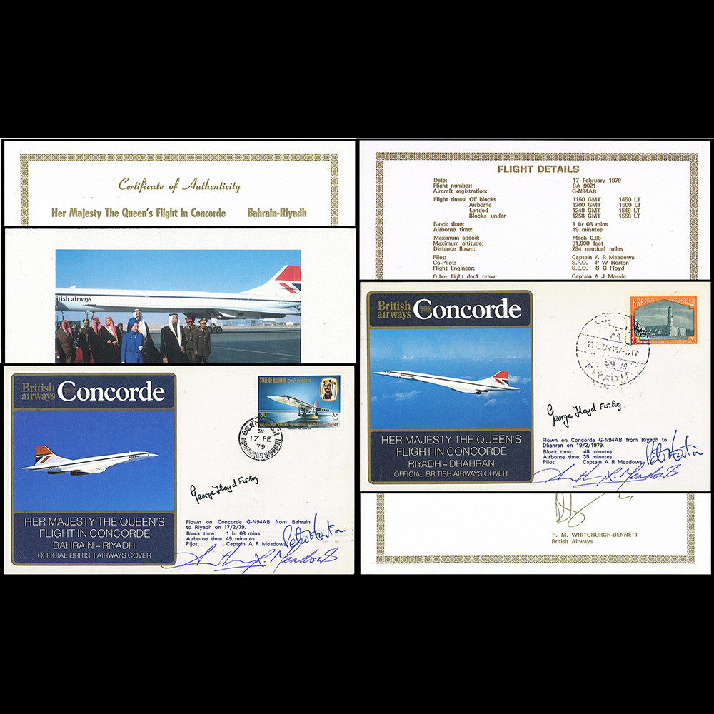 COBA79-2ROY2D: 2 Official BA covers carried on board “Royal Concorde British Airways Flight - Official Visit to the Emirates of HM Queen Elizabeth II, Bahrain - Riyadh and Riyadh - Dhahran, February 17, 1979” - Crew signed -
