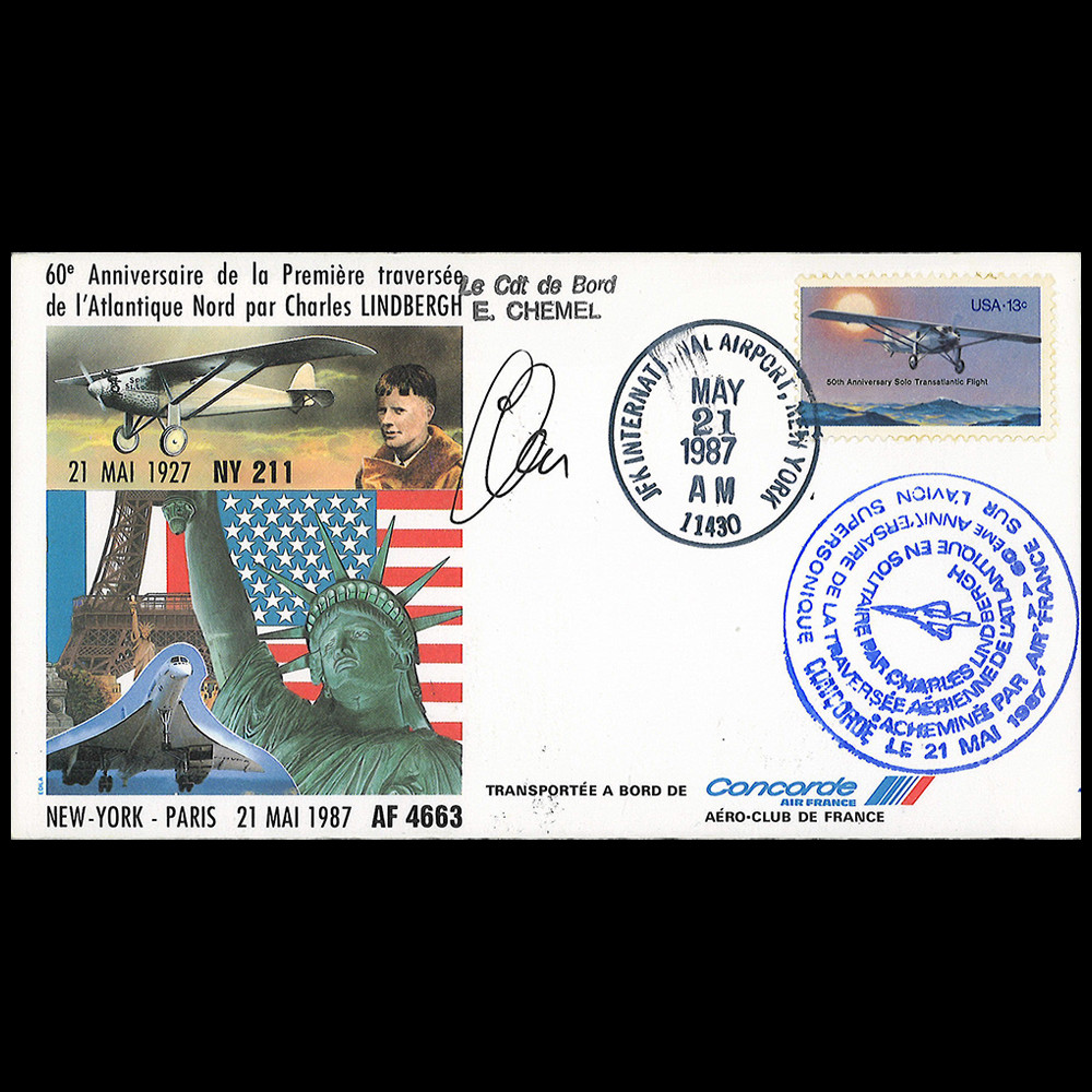 COAF87-5-21D: Flight cover carried on board “Air France Concorde Flight AF 4663 New York - Paris - 60th Anniversary of Lindbergh's Transatlantic Flight, May 21, 1927/1987” - Captain signed -