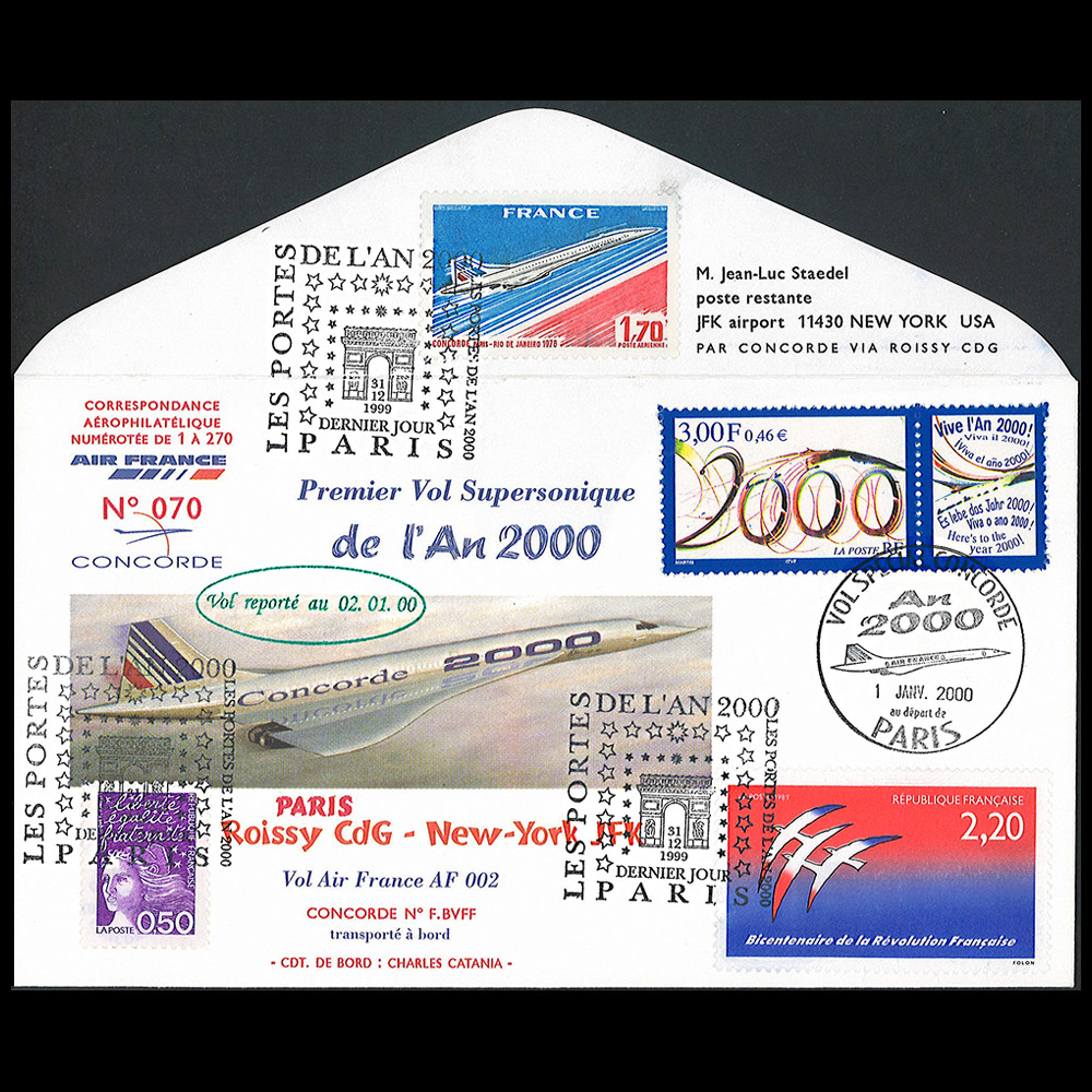 COAF2000T2: Flight cover carried on board “First supersonic Concorde Air France flight of the Year 2000 - AF 002 Paris - New York, January 1, 2000” - Folon -