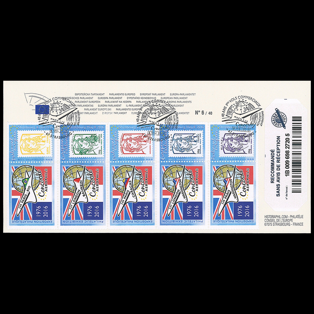 - Postage France (0.01, 20g Green Letter, 20g Priority Letter, 20g Europe, 20g Worldwide) "Marianne and Youth" fixed on a booklet strip of 5 perforated and gummed stamp holders "40 Years of the First Concorde Commercial Flights 1976-2016"
