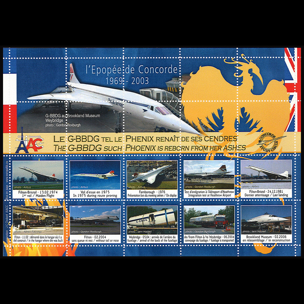 Here is the 11th AIAC sheetlet from the “L’épopée de Concorde 1969-2003” collection. It shows the story in pictures of the first production British Airways Concorde. From its first flight in 1974, to its withdrawal from service in 1981 and its total restoration from 2002 to 2006.