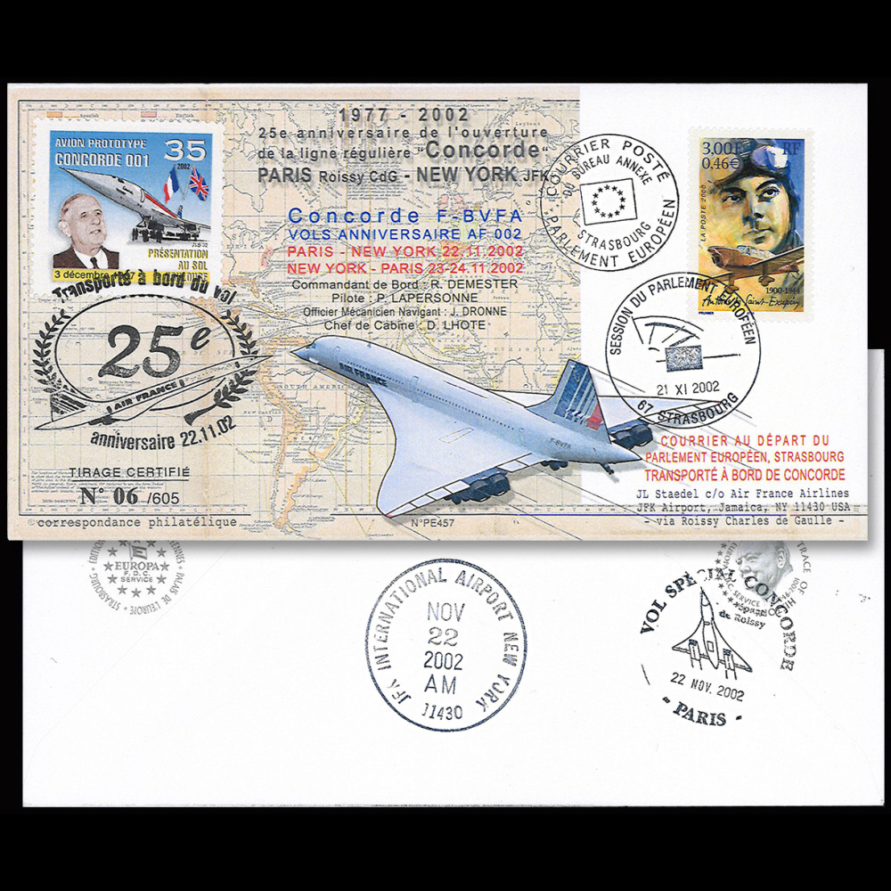 - Transit postal stamp "Paris Concorde special flight 22.11.2002" and arrival stamp "New York JFK 22 Nov. 2002" on the back.