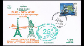 1) Cover Postage (TYPE 1) France €0.46 "Bicentenaire France - Australia Flinders-Baudin 1802" / Illustrated postmark Paris "Special Concorde flight departing from Roissy" 22.11.2002 / FLIGHT AUTHENTICATION STAMP (GREEN) " Carried on board the Concorde flight - 25th anniversary 11/22/2002" / Arrival stamp "New York JFK 22 Nov. 2002" on the back.