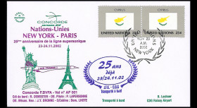 3) Cover Postage (TYPE 1) United Nations (UN) pair 25c "Flags of the Member States of the United Nations - Cyprus" / Postmark "United Nations New York" November 23, 2002 / FLIGHT AUTHENTICATION STAMP (PURPLE ) "Transported on board the Concorde flight - 25 years already 23/24.11.2002" / Arrival stamp "Paris Roissy CDG - Arrival 24 Nov. 2002" on the back.