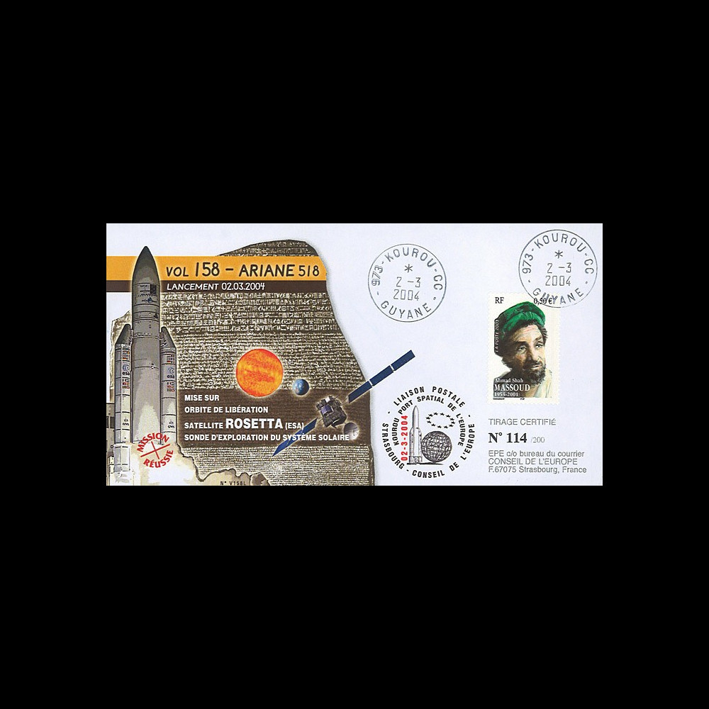N°V158L-T1 : FDC KOUROU (French Guiana) "March 2, 2004 : Launching ARIANE 5G+ Rocket - Version No. 518 - Flight N°158 / Arianespace to Launch the Robotic Spacecraft ROSETTA (European Space Agency : ESA) to perform a detailed study of Comet Churyumov-Gerasimenko" (TYPE 1) 2004 :