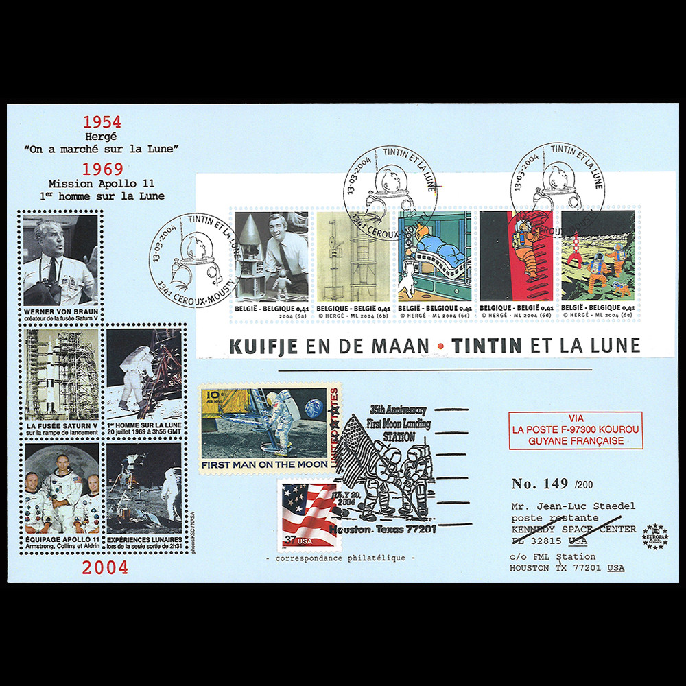 N°TIN04-1: Maxi FDC philatelic twinning BELGIUM - KOUROU (FRENCH GUIANA) - UNITED STATES "TINTIN AND THE MOON: 1954, Explorers on the Moon"