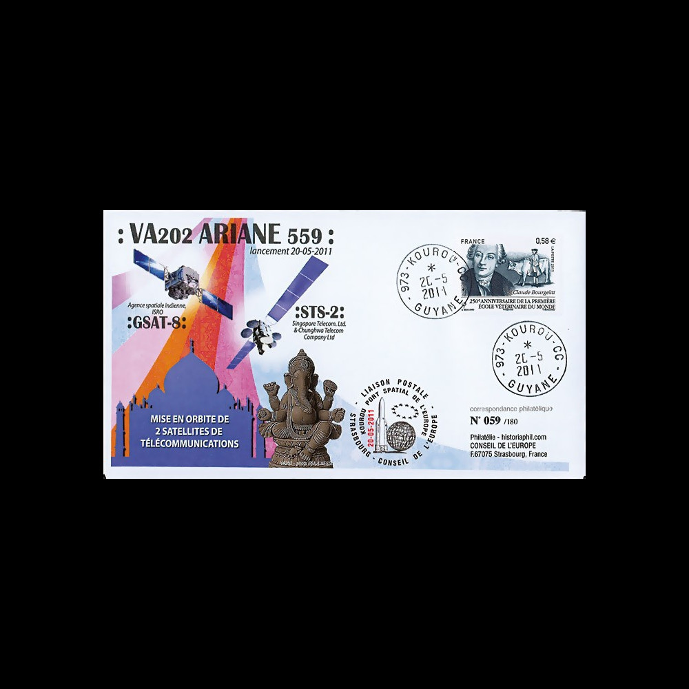 N°VA202L-T1 : FDC KOUROU (French Guiana) «FLIGHT N°202 Rocket ARIANE 5-ECA - 559 launching - Orbit telecommunications satellites STS-2 et GSAT-8»