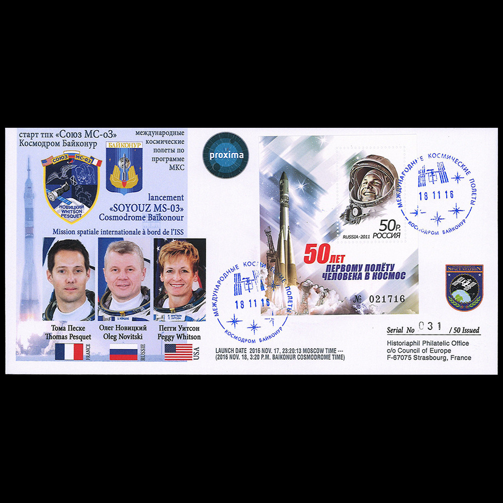 PROXIMA16-2 : FDC Russia "Launching Soyuz MS-03, 11 Nov. 2016 / International Space Mission PROXIMA / P. Whitson (USA), O. Novitsky (Russie), T. Pesquet (France)".