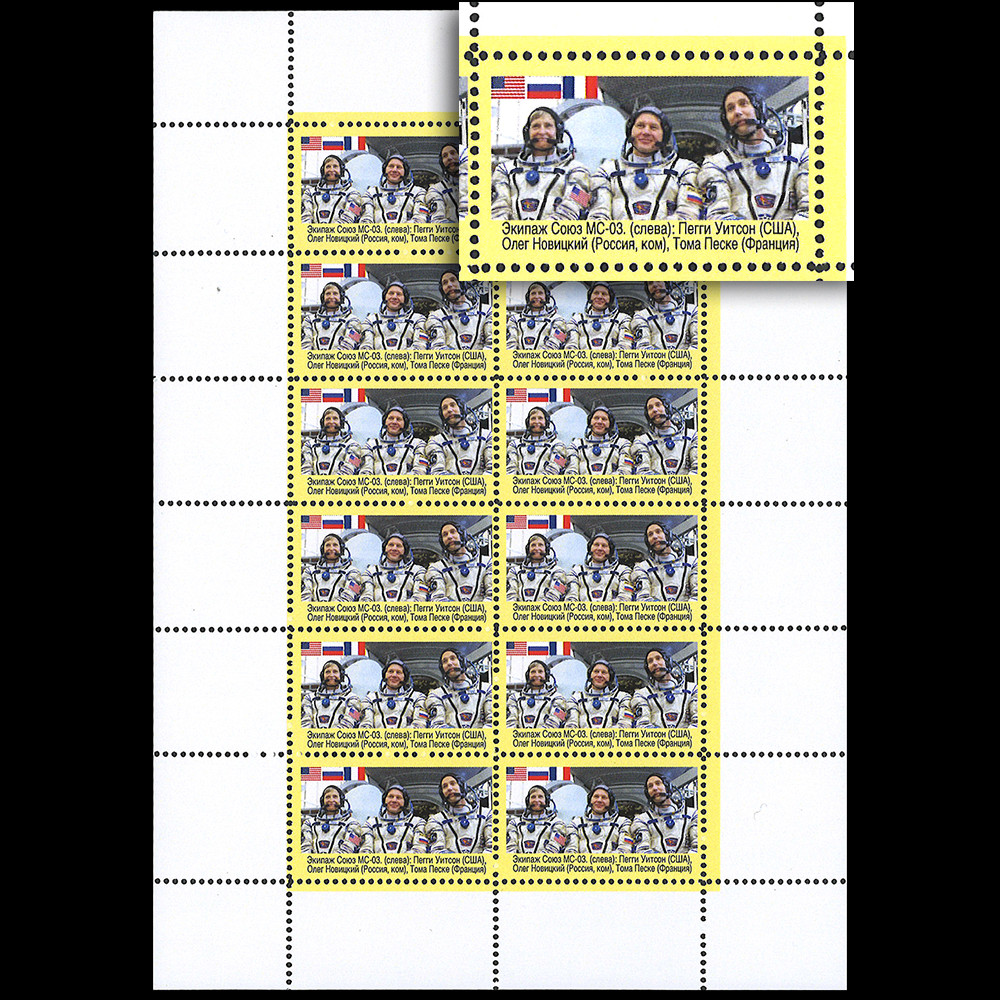 PROXIMA16-1F : Sheetlet of 12 perforated labels (cinderellas) RUSSIA 2016 "SOYUZ MS-03 Crew Peggy Whitson (USA/NASA), Oleg Novitsky (Russia/Roskosmos) and Thomas Pesquet (France/ESA/Mission PROXIMA)"