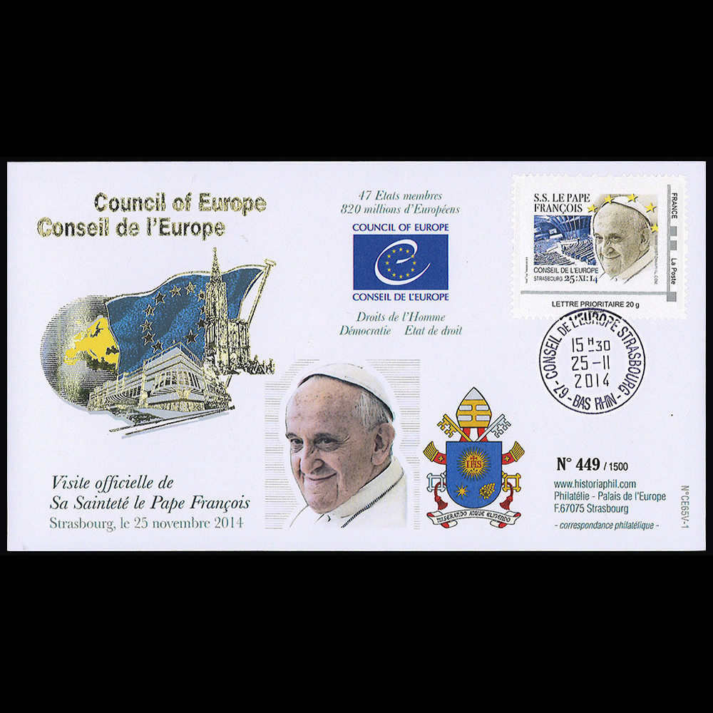 - Postage France (TYPE 1) Personalized Stamp IDTimbre© Priority Letter (BLUE) "Official visit of His Holiness Pope Francis to Council of Europe 25.XI.2014"