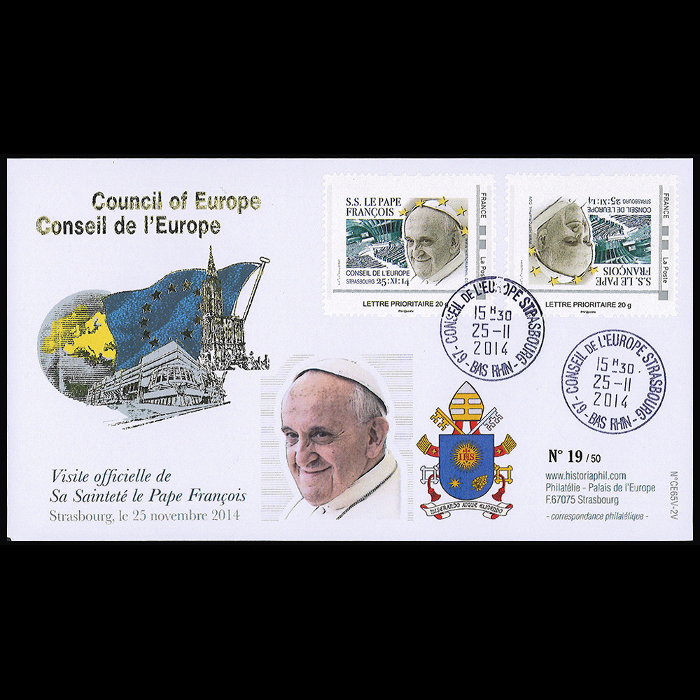 - Postage France (TYPE 2) 2 Personalized Stamps IDTimbre© Priority Letter (GREEN) "Official visit of His Holiness Pope Francis to Council of Europe 25.XI.2014" including 1 stamp with "INVERTED POPE VARIETY" (reverse image)