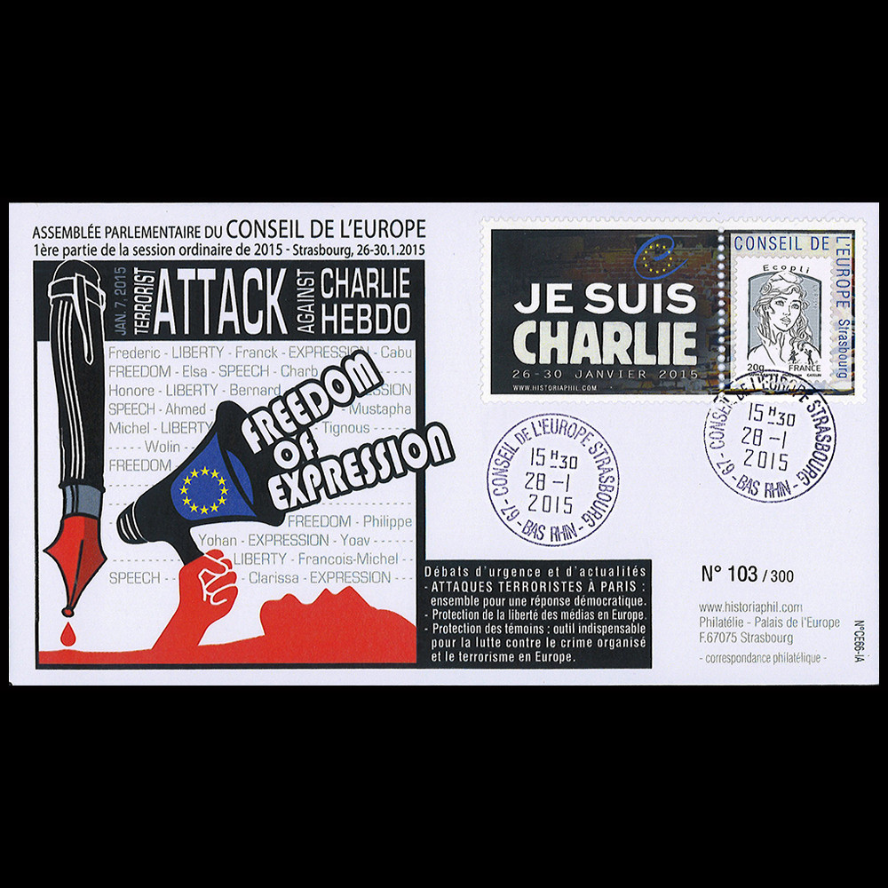 - Postage France TVP Ecopli 20g grey "Marianne and Youth, 2015" on perforated label stamp holder "Council of Europe 26-30.01.2015 - I AM CHARLIE"