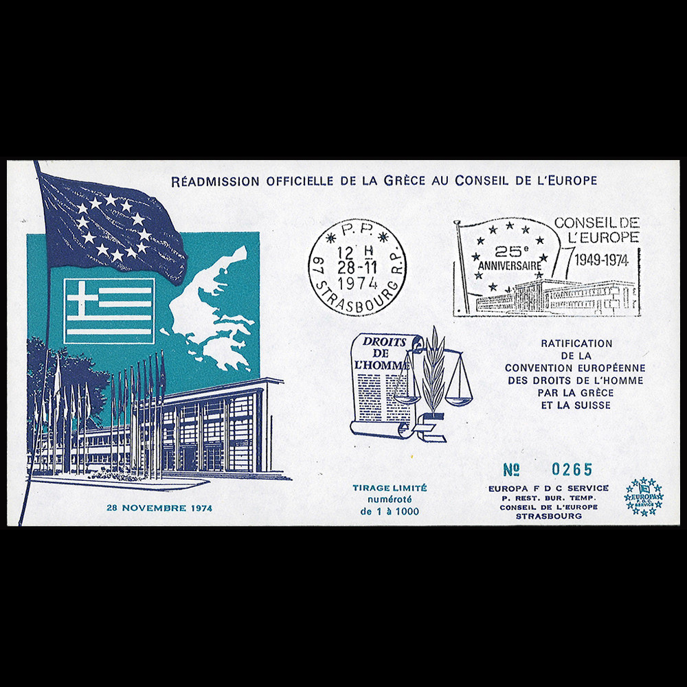 - Postage paid in France (P.P.) with an illustrated postmark "Strasbourg - 25th Anniversary of the Council of Europe 1949-1974" November 28, 1974