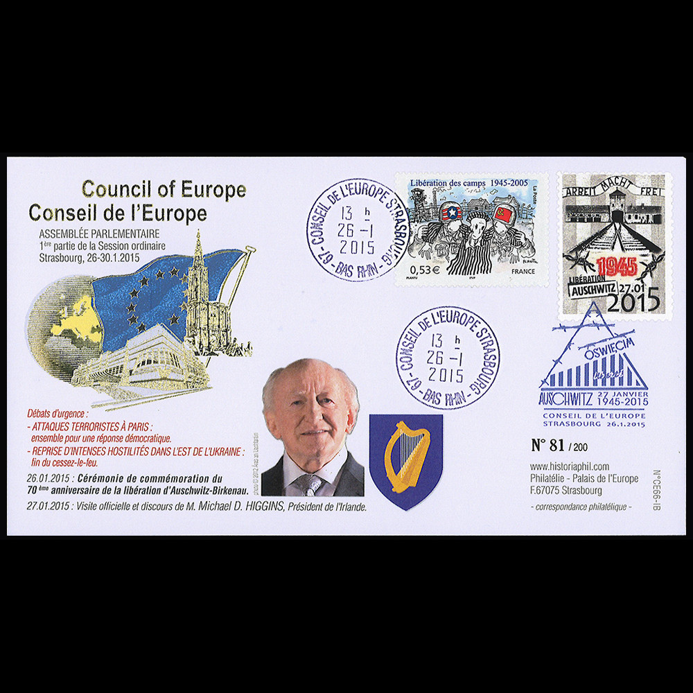 N°CE66-IB: FDC 'Prestige Edition' Session of the Parliamentary Assembly of the Council of Europe in Strasbourg (France) 26-30.01.2015 - Commemoration ceremony of the 70th anniversary of the Liberation of the Auschwitz Birkenau Concentration and Extermination Camp (Poland)"