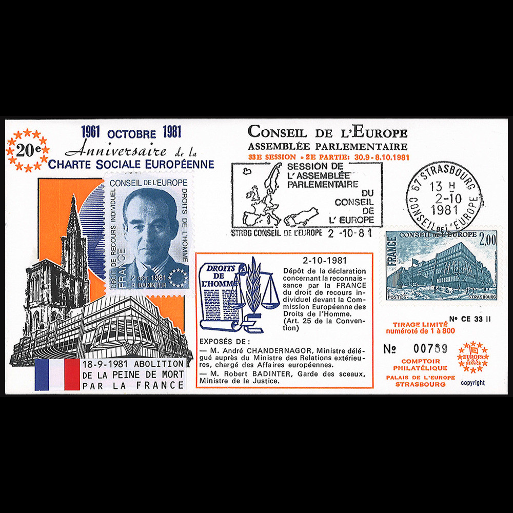 - Perforated Label (cinderella) "Council of Europe - Right of individual appeal - Human Rights - France October 2, 1981 - R. Badinter"