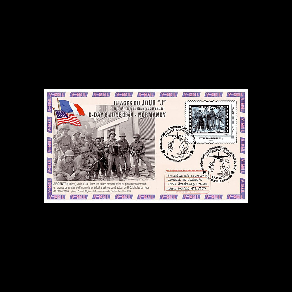 Franked France 1 value Personalized Stamp Priority Letter 20g "D-Day Photograph - Argentan (Orne, France) Summer 1944 : In Ruins, American Soldiers around H.C. Medley playing accordion" postmarked GF Cricqueville "Inauguration of the Pointe du Hoc restoration" (France) dated June 6, 2011