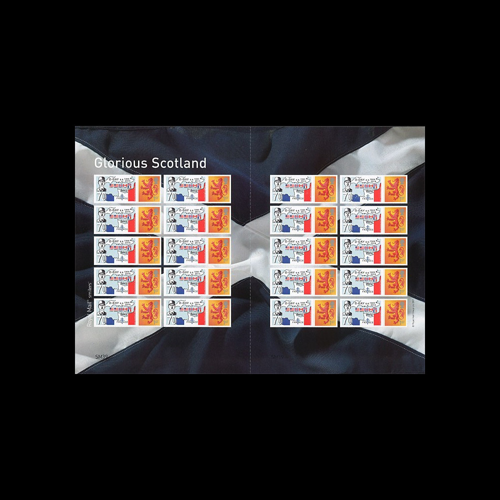 N°DEB14-09F : UNITED KINGDOM Sheetlet of 20 values Personalized stamps First Class “June 6, 1944-2014 : 70th anniversary of the Landing in Normandy (D-DAY) - General DE GAULLE and Cross of Lorraine / UTAH BEACH (US Soldiers - USA) - OMAHA BEACH (US Soldiers - USA) - GOLD BEACH (English Soldiers - United Kingdom) - JUNO BEACH (Canadian Soldiers - Canada) - SWORD BEACH (English and French Soldiers - United Kingdom and France) / 1939-45 : World War 2 (WWII) / Glorious Scotland - Scottish Lion" (Size : 210 x 297 mm ; unfolded) 2014 :