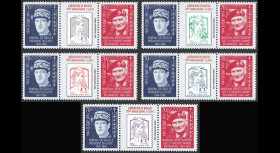 DEB14-11PT1/5 : FRANCE Set of 5 values "Marianne and Youth, 2014" on Private Stamp Display Units perforated and gummed "June 7, 1944-2014 : 70th anniversary of the Landing in Normandy - D-DAY - Bayeux (France) First French Town liberated / General DE GAULLE, President of Provisional Government of French Republic and Field Marshal MONTGOMERY "Monty", Commander of the 21st British Army Group (1944-45) / 1939-1945 : World War 2 (WWII)" 2014 :