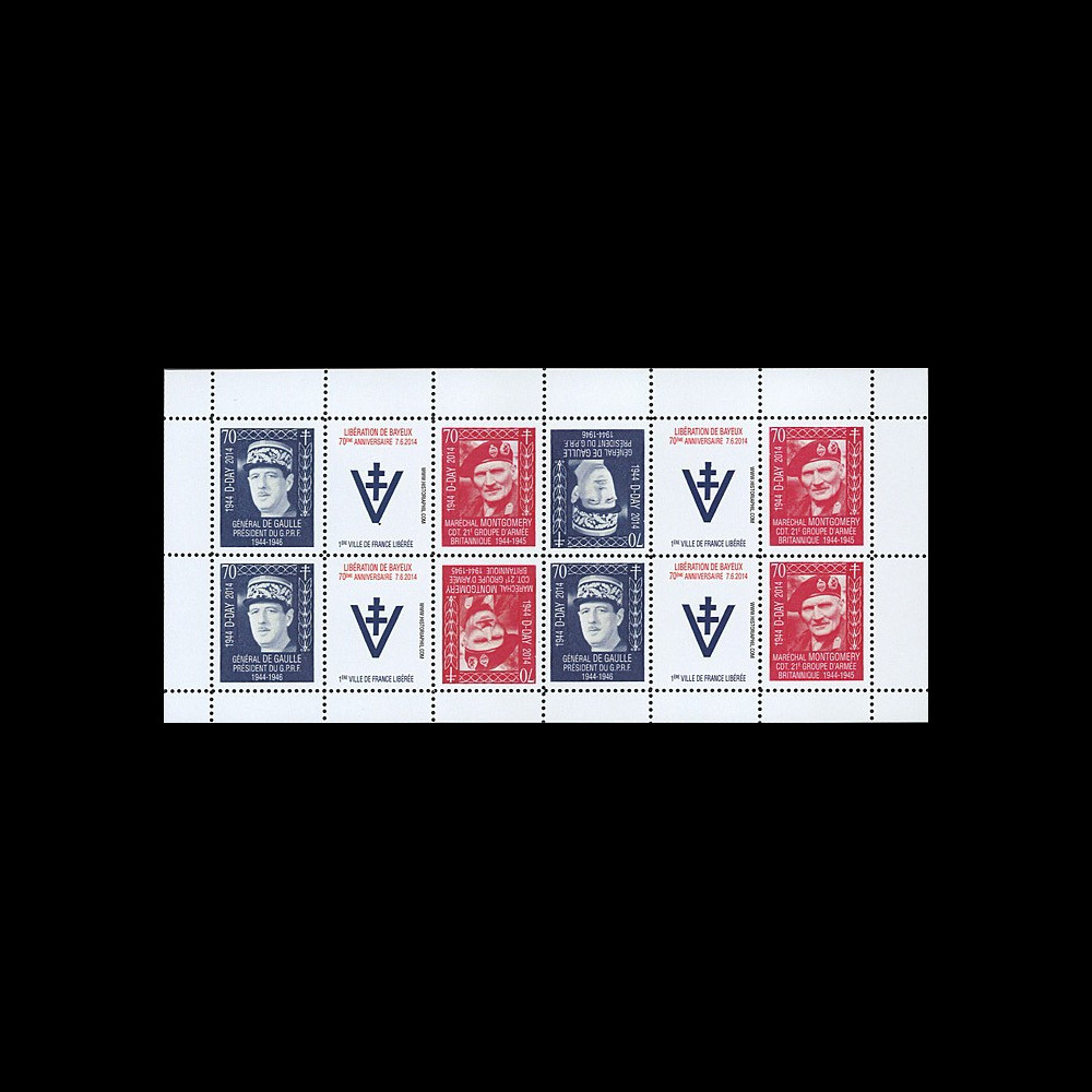 No. DEB14-11FD : Sheetlet of 12 labels INVERTED PAGES perforated and gummed "June 7, 1944-2014 : 70th anniversary of the Landing in Normandy - D-DAY - Bayeux (France) First French Town liberated / General DE GAULLE, President of Provisional Government of French Republic and Field Marshal MONTGOMERY "Monty", Commander of the 21st British Army Group (1944-45) / 1939-1945 : World War 2 (WWII) / Cross of Lorraine & V of Victory" (Size : 9,7 x 21 cm) 2014 :