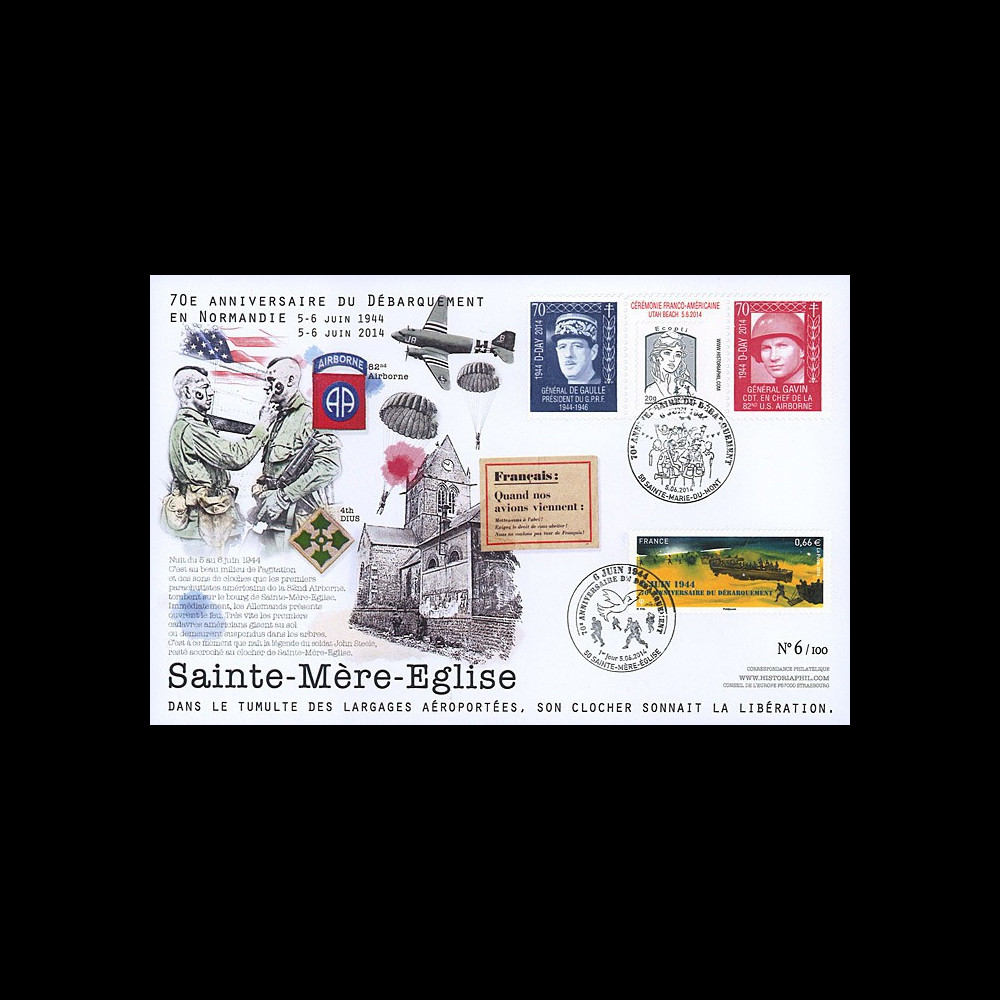 DEB14-14 : Maxi FDC FRANCE "June 5, 2014 : First Day in Sainte-Mere-Eglise (France) - 70th anniversary of the Landing in Normandy (D-DAY) / June 5, 2014 : Special postmarked in Sainte-Marie-du-Mont (France) - 70th anniversary of the Landing in Normandy (D-DAY) / General James M. GAVIN "Slim Jim", Chief Commander of the 82nd U.S. AIRBORNE Division - Operation BOSTON : The Paratroopers of 82nd Airborne dropped on Sainte-Mere-Eglise / Aircraft Douglas C-47 "Dakota" / Général DE GAULLE / 1939-45 : World War 2 (WWII)" (Size : 13,5 x 20,8 cm) 2014 :