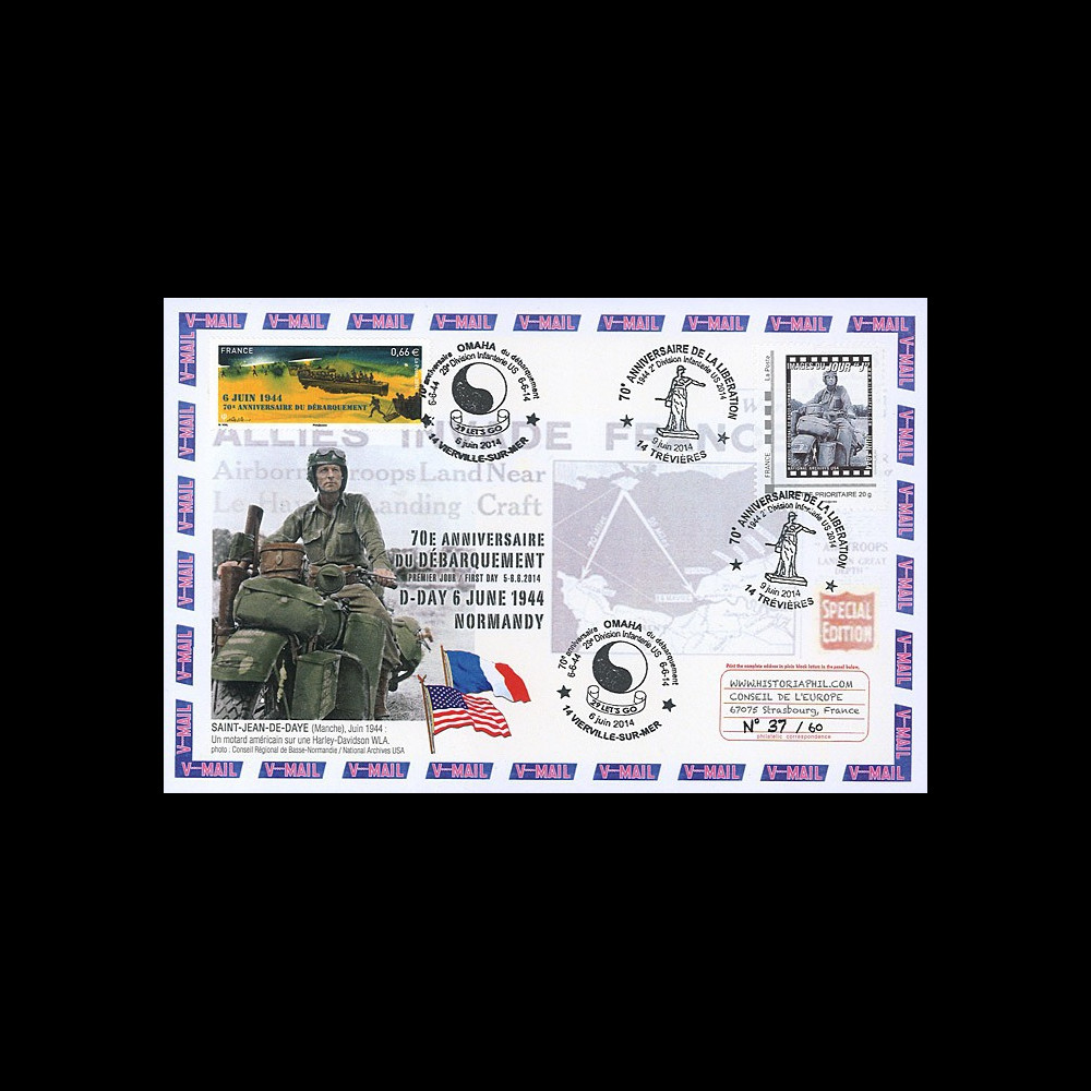 DEB14-30 : Maxi FDC FRANCE "June 6, 2014 : Special postmarked in Vierville-sur-Mer (France) - 70th anniversary of the Landing in Normandy (D-DAY) / June 9, 2014 : Special postmarked in Trévières (France) - 70th anniversary of the Liberation of Trévières / Saint-Jean-de-Daye (Manche, France) June 1944 : American Soldier on a Harley-Davidson WLA Motorbike / 1939-45 : World War 2 (WWII)" (Size : 13,5 x 20,8 cm) 2014 :