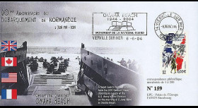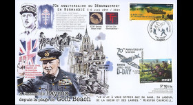 DEB14-32 : Maxi FDC FRANCE "June 5, 2014 : Special postmarked in Carentan (France) - 70th anniversary of the Landing in Normandy (D-DAY) / June 6, 2014 : Special postmarked in Saint-Laurent-sur-Mer (France) - 70th anniversary of the Landing in Normandy (D-DAY) / OMAHA BEACH : Combat Medics - U.S. Army Nurse Corps 'Medical Company' - Jeep Willys / General DE GAULLE / 1939-45 : World War 2 (WWII)" (Size : 13,5 x 20,8 cm) 2014 :