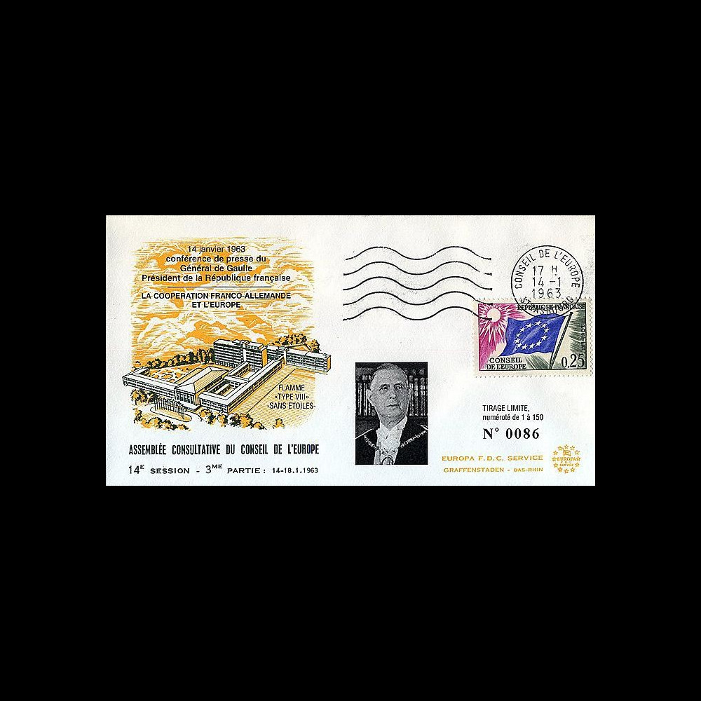 N°CE14 III type3: FDC (envelope) «Strasbourg, Consultative Assembly of the European Council, 14th session - 3rd part - 14.1.1963 : the press conference of the général de Gaulle about the Franco-German cooperation and Europe»
