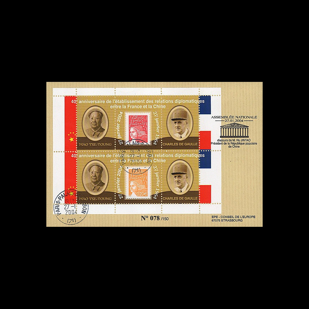 AN04-CH3 : FRANCE FDC “27.01.2004 : 40 years of Diplomatic Relations between France and China / 26-29.01.2004 : State visit in France of Chinese President Hu JINTAO“