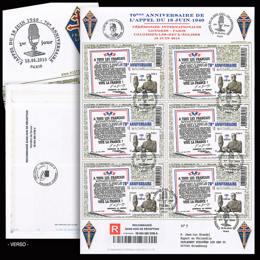 - Postage France 6x block €0.56 “WW2 - General de Gaulle - Appeal to Resistance of June 18, 1940 - TO ALL THE FRENCH (2010)”